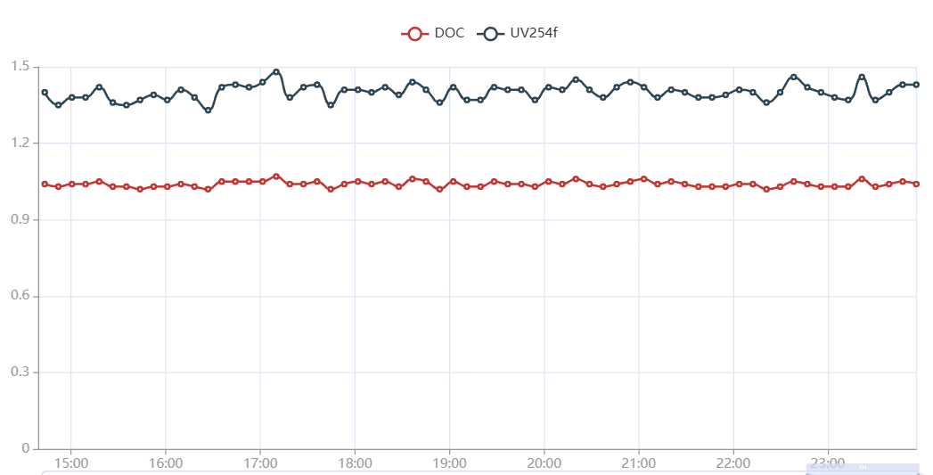 艾晟特還建議通過“有機物去除法”來優(yōu)化后臭氧的投加控制(圖5 艾晟特應(yīng)用全光譜分析儀在某水廠炭濾池出口監(jiān)測有機物),這是一種直接且回歸“臭氧-生物活性炭”深度處理本源的控制邏輯,該工藝最主要目的是降低自來水中有機物、異味和色度等,減少消毒副產(chǎn)物的產(chǎn)生。通過在后臭氧接觸池進(jìn)水、出水和炭池出水設(shè)置實時、免試劑的紫外可見光全光譜法的有機物在線監(jiān)測儀,可實現(xiàn)DOC和UV254的實時可靠監(jiān)測。將其與余臭氧實時在線監(jiān)測相結(jié)合,可以更好地實現(xiàn)對后臭氧的精準(zhǔn)高效投加。