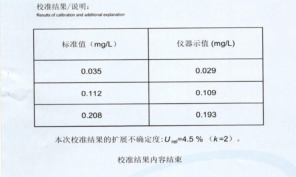 于是,水廠首當(dāng)其沖需要確保有在線水中余臭氧分析儀,且能夠勝任0.1mg/L以下濃度的工作環(huán)境。艾晟特從2019年以來,陸續(xù)幫助眾多水廠更新了水中余臭氧分析儀。艾晟特采用紫外可見光全光譜掃描法的水中余臭氧分析儀,結(jié)合超聲波自動清洗系統(tǒng),實現(xiàn)了可靠、免試劑、少維護(hù)地在線測量水中余臭氧。為確保水中余臭氧分析儀的準(zhǔn)確性,每年將水中余臭氧分析儀送往計量院做校準(zhǔn)(圖3 紫外可見光掃描法的水中余臭氧分析儀計量校準(zhǔn)數(shù)據(jù))。