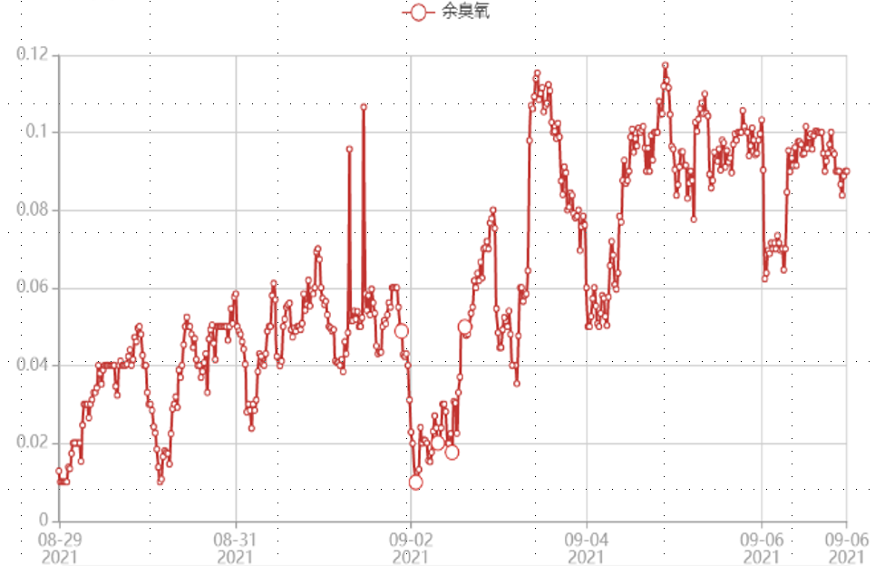 我們走訪過很多采用“流量控制法”的水廠,在線余臭氧的數(shù)據(jù)會出現(xiàn)兩種現(xiàn)象,一種是在線水中余臭氧的測量數(shù)據(jù)為零(圖1 某水廠沒有響應(yīng)的在線余臭氧分析儀),一種是在線水中余臭氧的測量數(shù)據(jù)波動大(圖2 流量等比例控制的水中余臭氧)。其中在線水中余臭氧的測量數(shù)據(jù)為零的原因有二:在線水中余臭氧監(jiān)測儀對這種應(yīng)用環(huán)境下沒有響應(yīng)或者臭氧的實際加注量不夠。