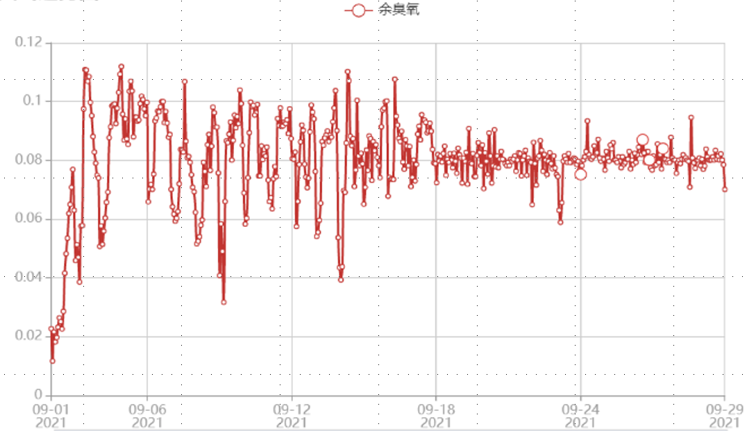 水廠可以在“流量控制法”的基礎(chǔ)上完善成“流量前饋+余臭氧反饋控制法”:流量前饋結(jié)合水中余臭氧反饋。這種控制方法在應(yīng)對水質(zhì)、流量變化時,可以更加科學(xué)經(jīng)濟(jì)穩(wěn)定地控制后臭氧的加注量。(圖4 某智慧化水廠后臭氧逐漸實現(xiàn)閉環(huán)控制后的數(shù)據(jù))